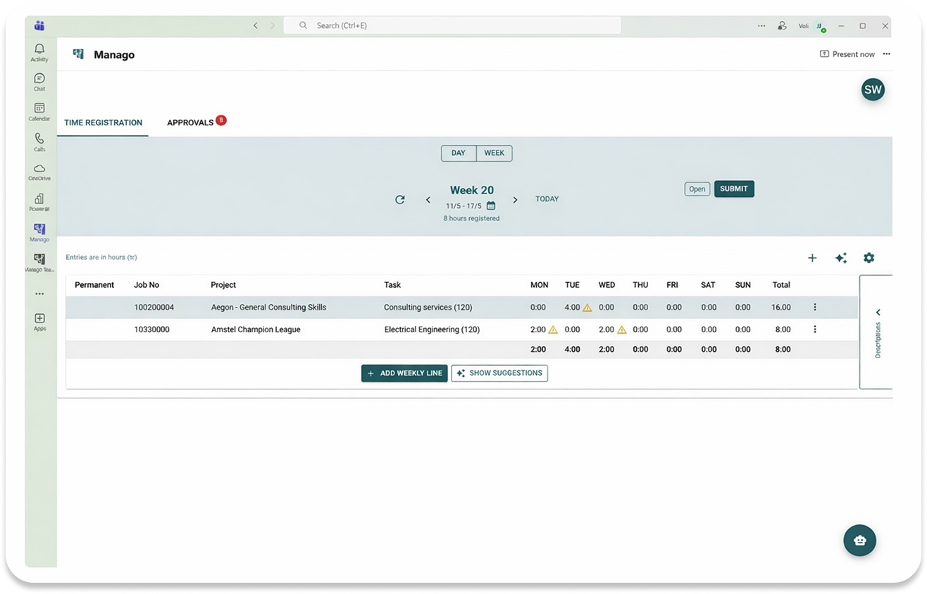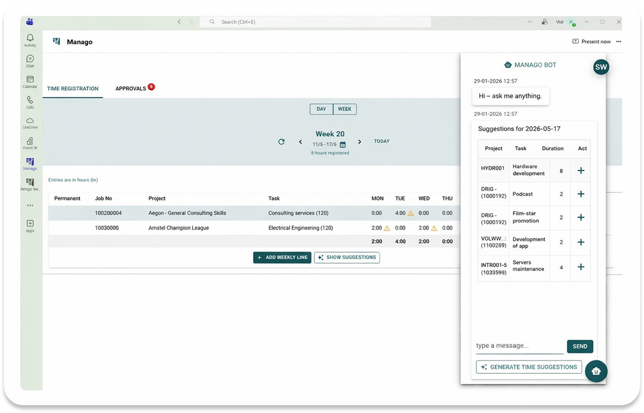Most employees work in Teams all day and making Time capture available where you work all day long makes it much more likely to happen and improves accuracy