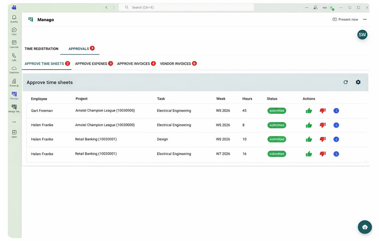Approval of Time, Expenses, Invoices and Vendor invoices via Mobile or Teams